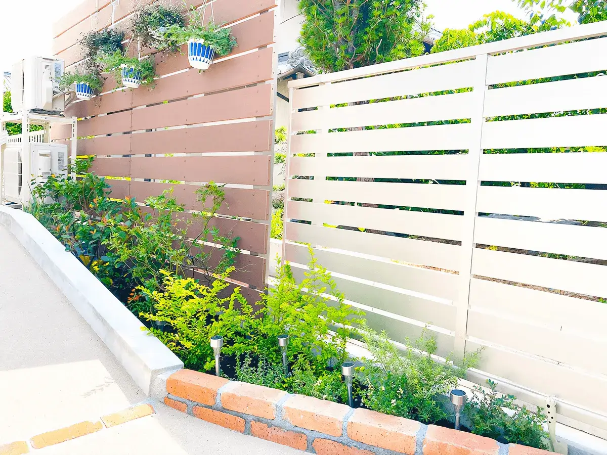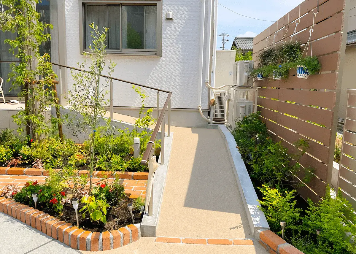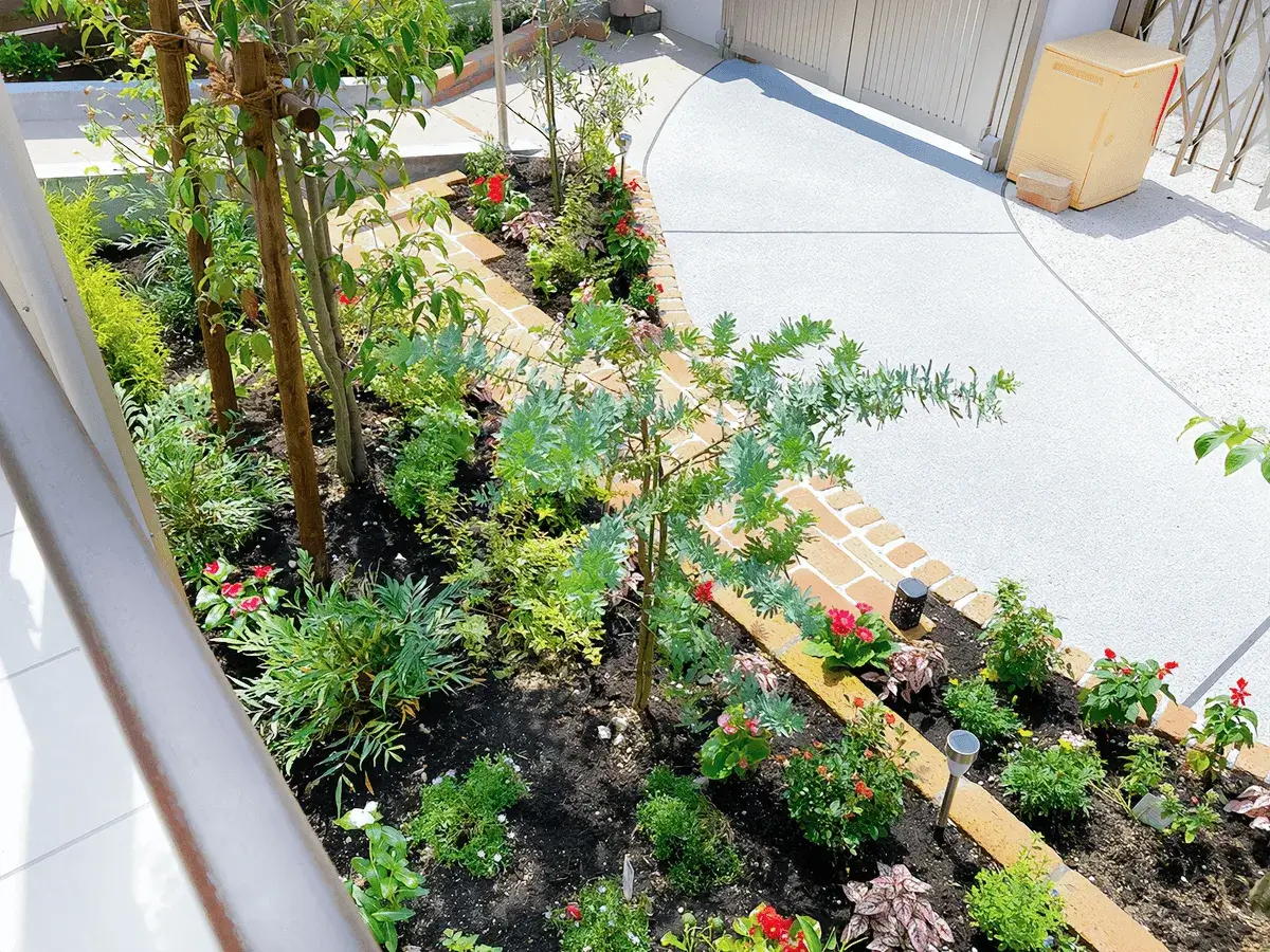 お客様のご要望で、「植物が好きなので植栽を植えてほしい」、「自分でガーデニングを楽しみたいため花壇スペースがほしい」とのことで、緑いっぱいの癒されるお庭に仕上がりました。