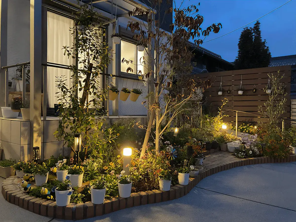 夜も楽しめられるように照明も提案させていただきました。植栽やお花たちを明るく照らしてくれる夜の外構はとても素敵です。ポールライトの上からのあかりが、色とりどりのお花をやさしく照らしてくれています。お客様にも喜んで頂きも毎日笑顔で過ごすことのできる空間にしました。