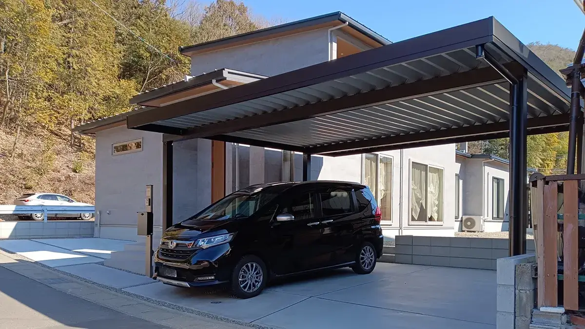 耐雪・耐風カーポートゆき盛りくんを設置しました。人気のブラックカラーのデザインで、住居外観にぴったりです。